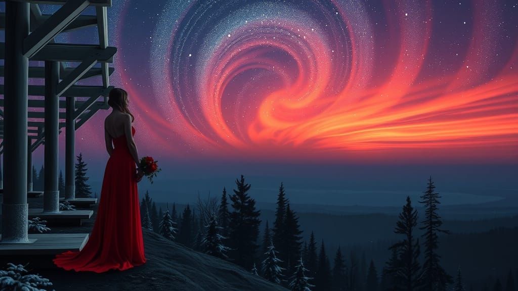 This image captures a serene winter night prom scene in a stunning pointillist style, with a woman in a vibrant red dress standing amidst a sunset-colored vortex of swirling colors, evoking a sense of peace and tranquility.