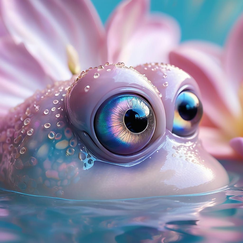 This surreal image features a slug-like being with large, iridescent eyes emerging from a pool of liquid crystal. Floating eyeballs and pastel cosmic swirls create an ethereal, dreamlike scene.