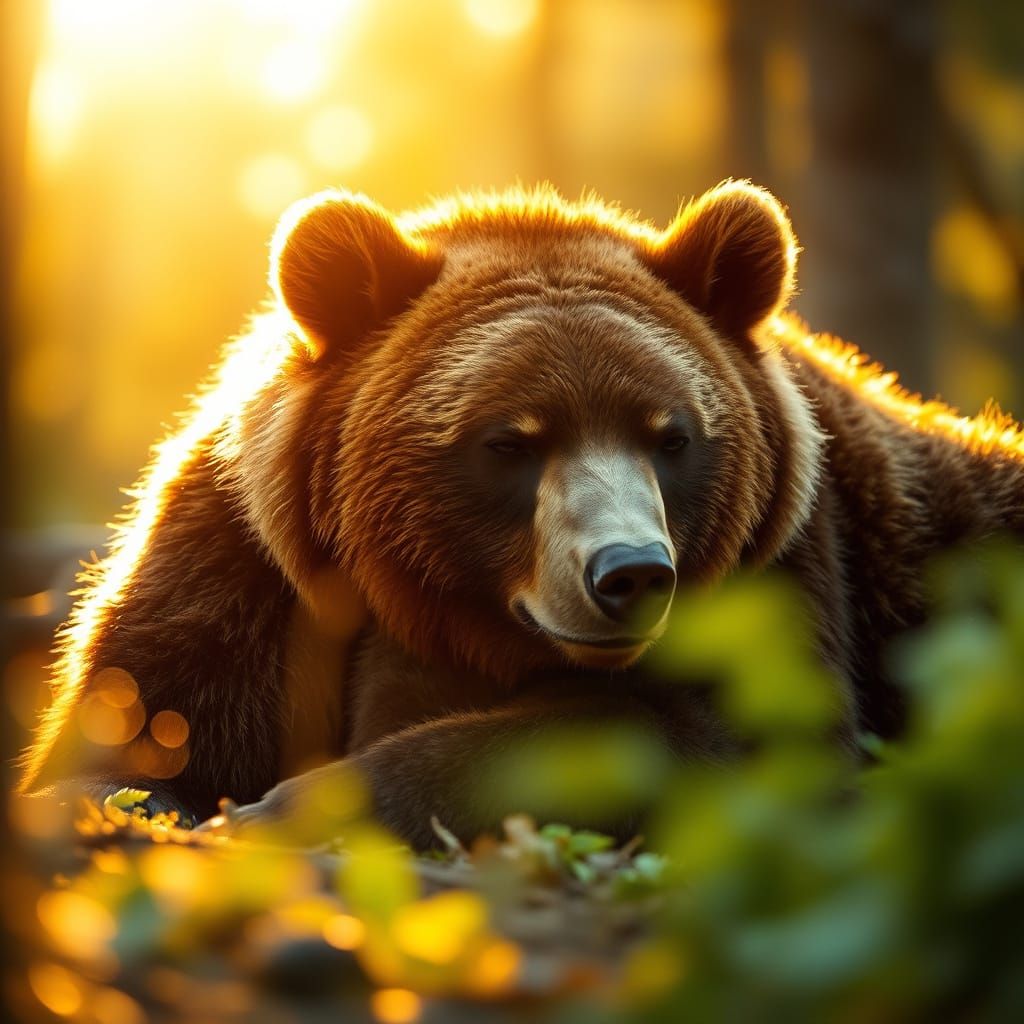 A captivating image of a bear sleeping peacefully in a sun-drenched forest. Natural lighting and a shallow depth of field enhance the scene, reminiscent of wildlife photography with artistic elements.
