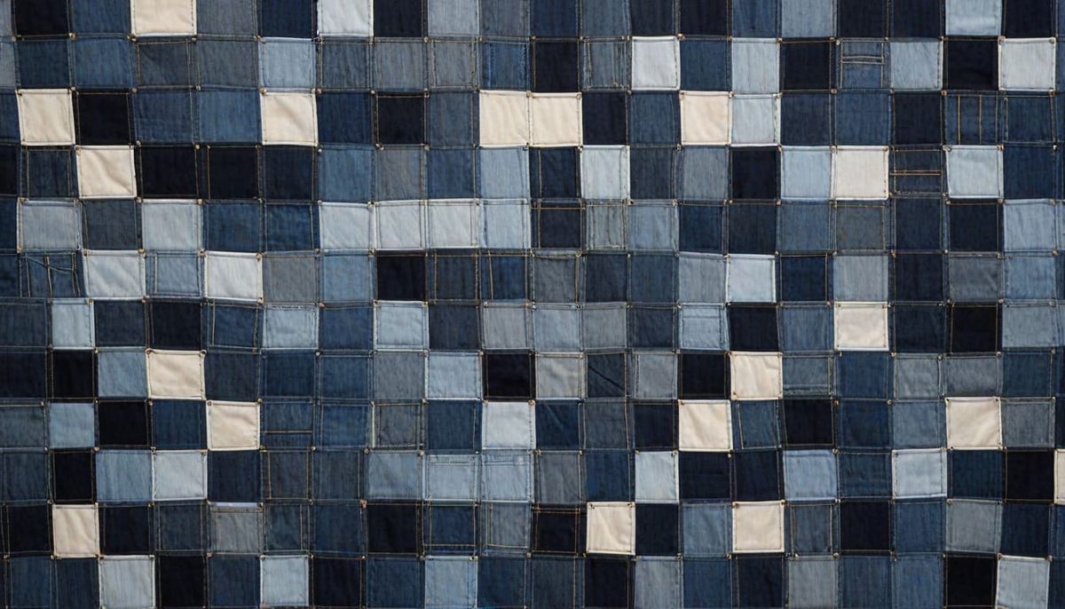 This image showcases a breathtakingly detailed denim patchwork quilt, crafted from repurposed jeans pieces with incredible hyperrealism and beauty.