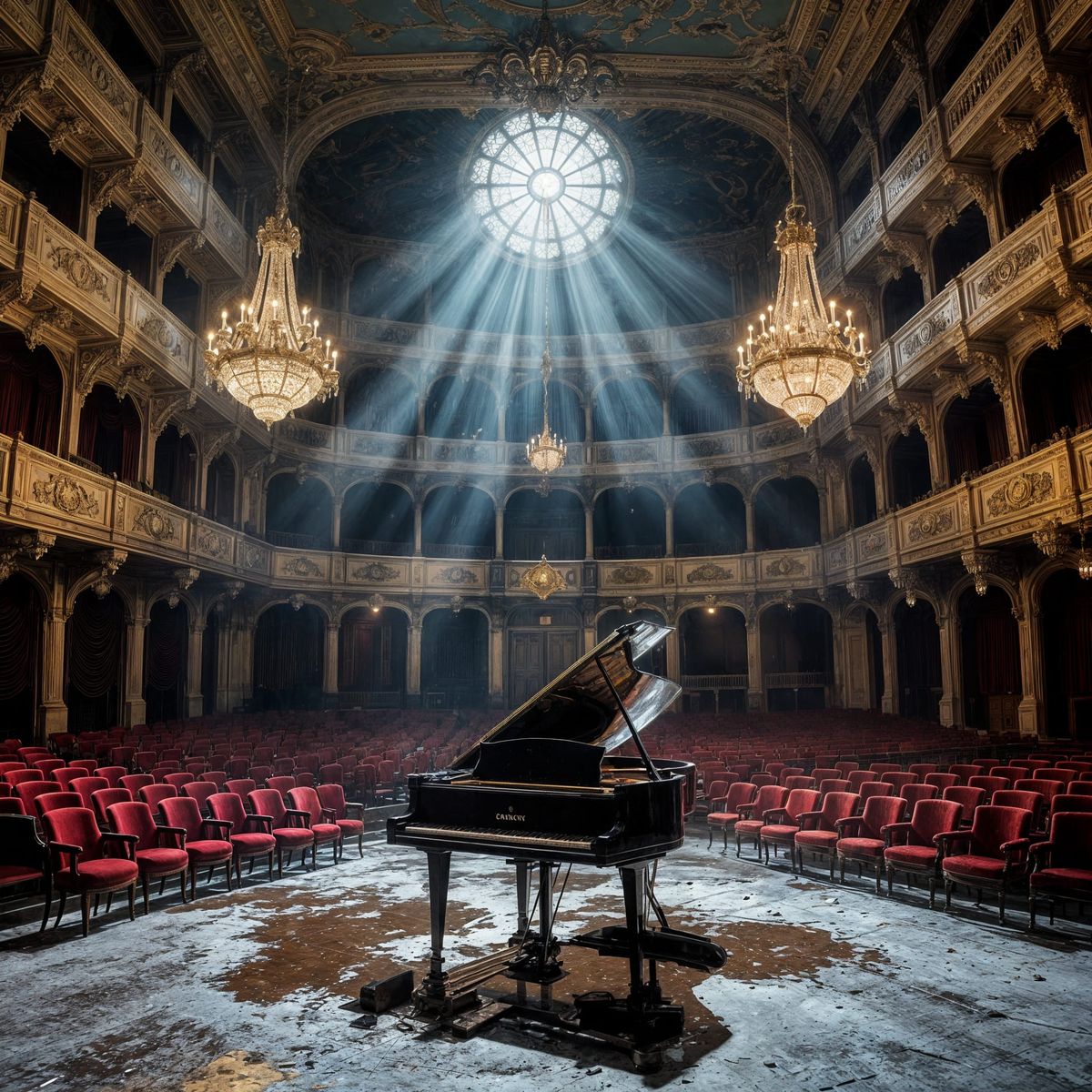 A cinematic view inside a grand, abandoned opera house. Sunlight illuminates a decaying hall with dust motes, a forgotten piano, and tattered velvet seats, evoking melancholic beauty.