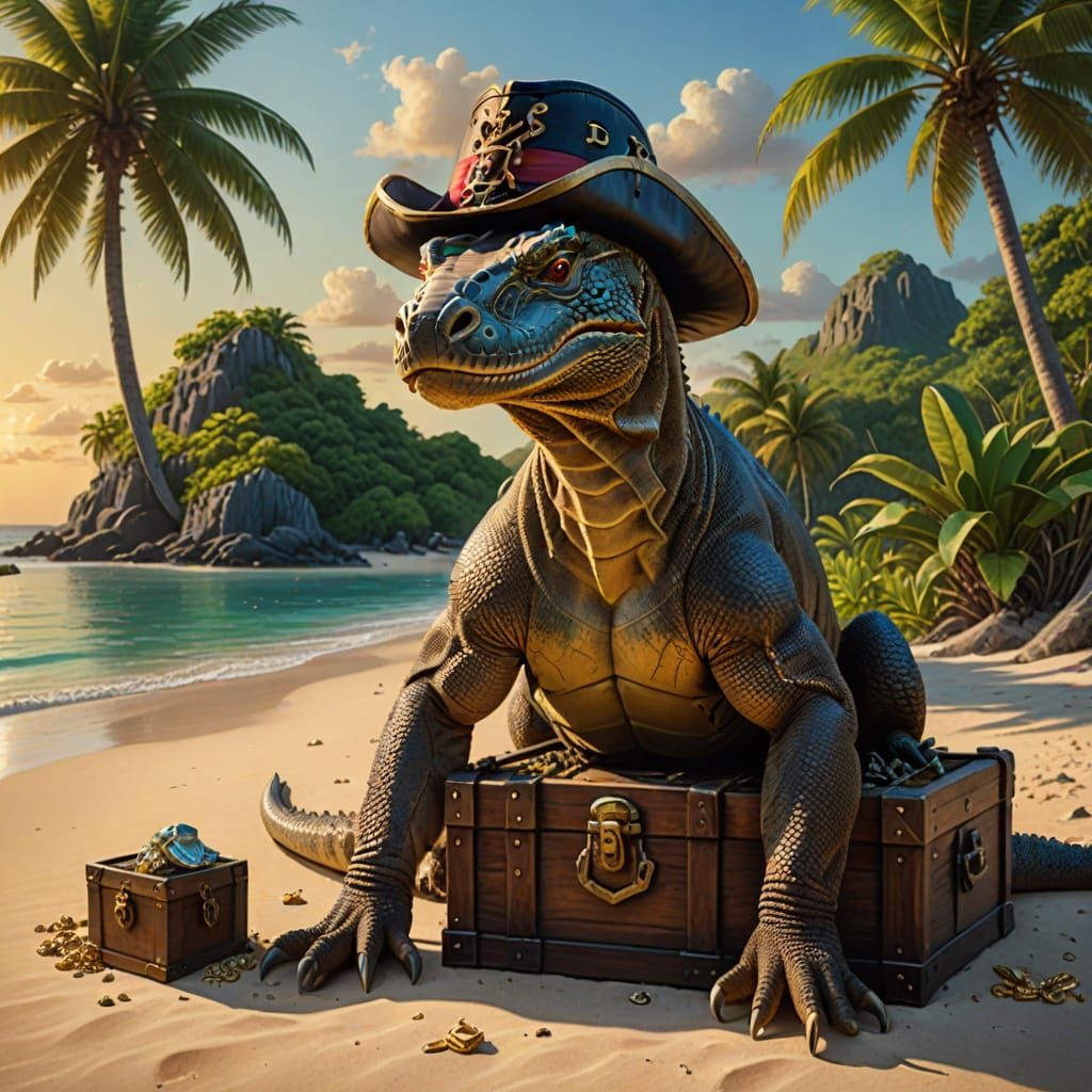 This image shows a Komodo dragon in a pirate hat protecting treasure on a beach as an oil painting. The golden hour lighting and vivid colors enhance the hyperrealistic details.