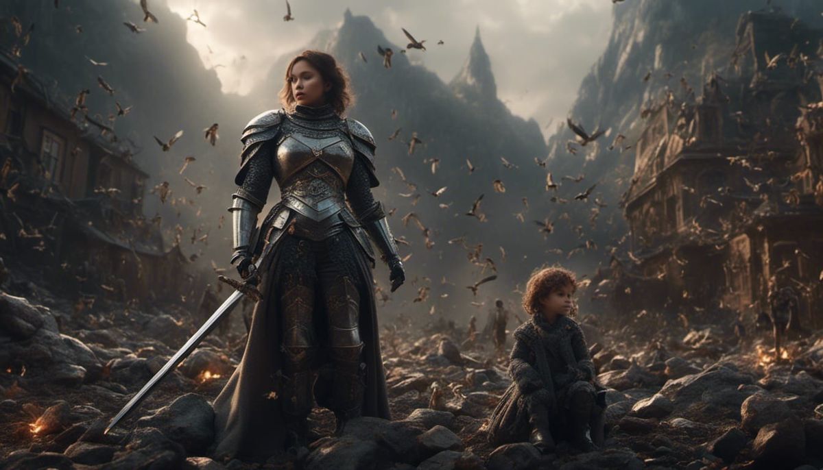 A digital matte painting shows a pregnant girl knight leading an army. The artwork is meticulously detailed with dramatic and cinematic atmosphere.