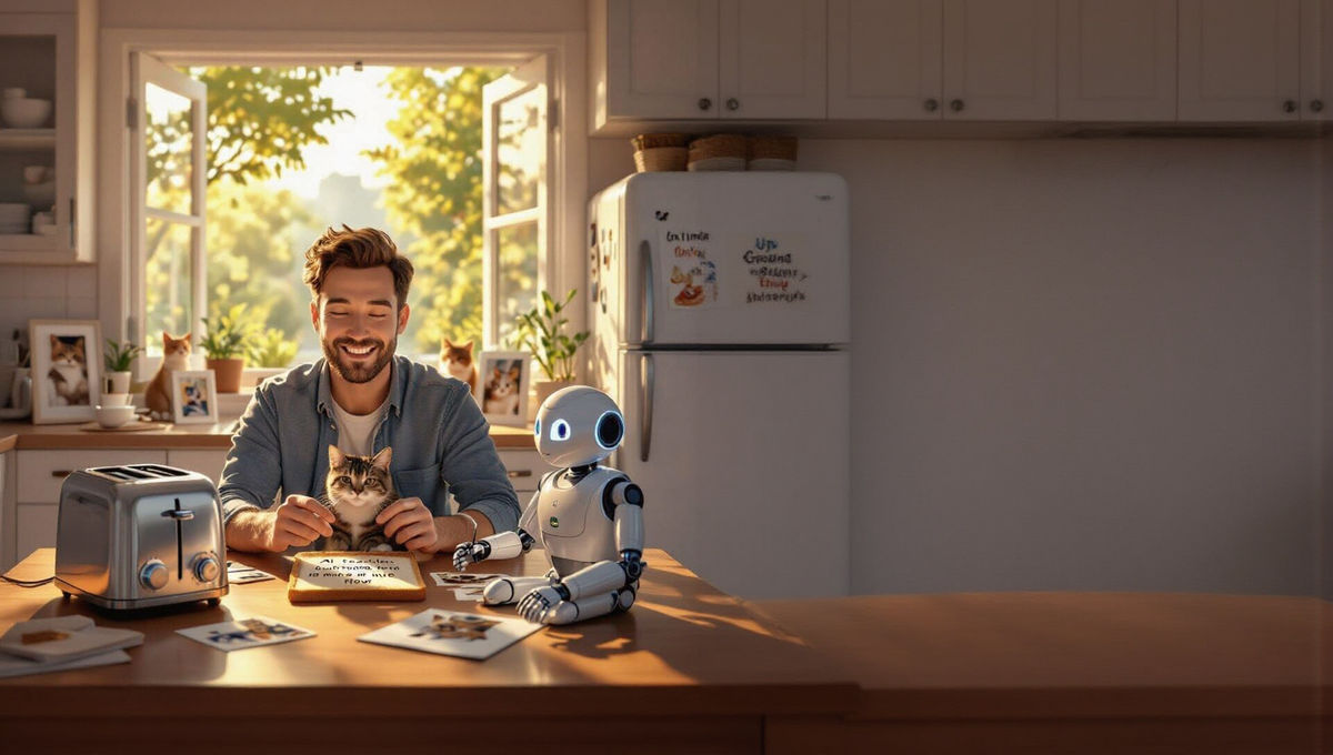 A charming kitchen scene bathed in morning light, featuring a man joyfully looking at cat photos. A silver toaster with robotic arms writes poetry on toast, as the fridge expresses its desire to plan recipes. As 3D anime art.