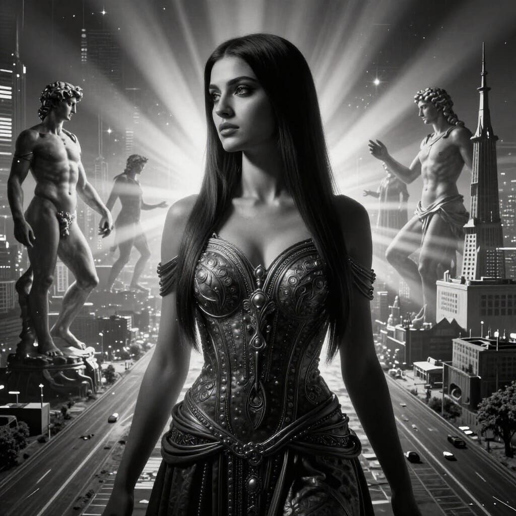 michelangelo paintings style in vertex, for glowing up crystal vertex beautiful armenian woman with ultra straight hair, very connected spiritual, only bicromic, silouette, city of shamballah in background with synthwave roads, hard decay, ray of lights between characters, ultra deep epic amplytude, ...