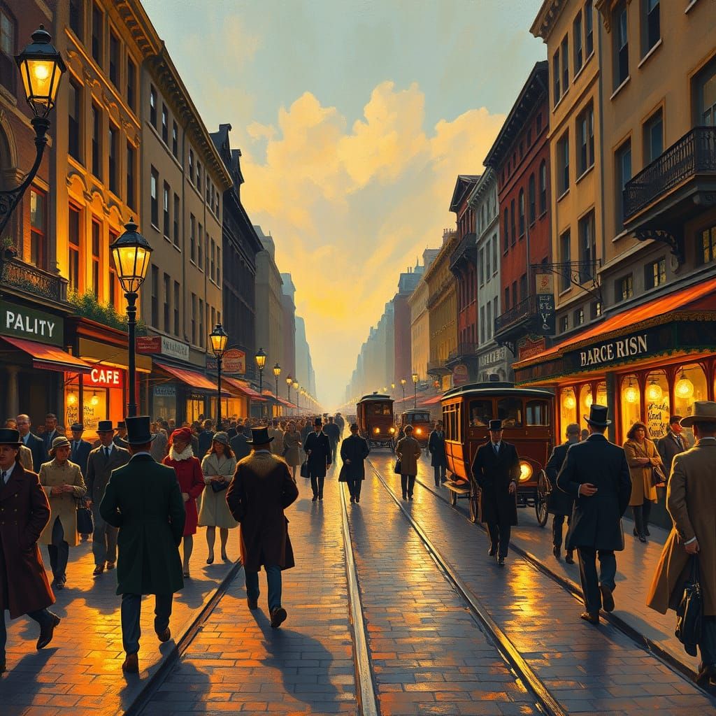 This image depicts a bustling street scene at dusk in the late 19th century, with warm golden light spilling from gas lamps and shop windows, casting a lively glow on the crowded pavement, and showcasing colorful signs, horse-drawn carriages, and old-fashioned streetcars, all rendered in loose, expressiv...