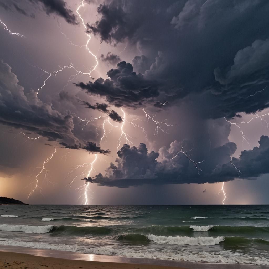 A dramatic seascape showing distant lightning illuminating the horizon. The turbulent sea and stormy atmosphere evoke a sense of wild beauty and natural chaos, in a sinister digital art style.