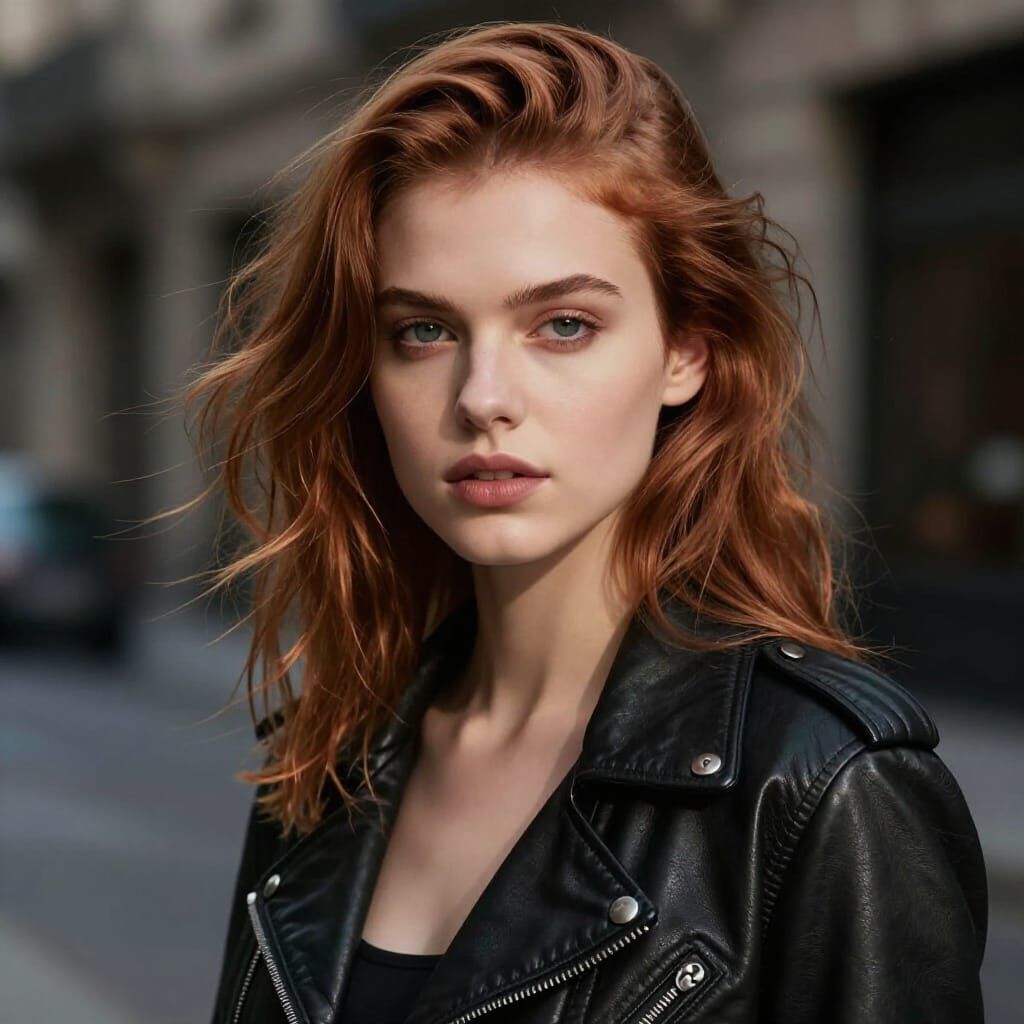 This image showcases a hyperrealistic portrait of a young woman with auburn hair, styled in a leather jacket. Soft studio lighting accentuates her features against a blurred urban backdrop, captured with sharp detail.