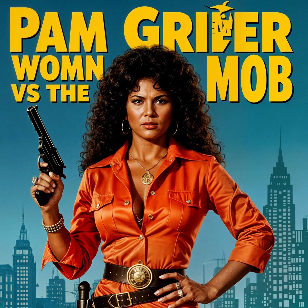 This image depicts a vintage-style 1970s movie poster. It features Pam Grier as 'Warrior Woman' battling the mob in a vibrant, action-packed scene reminiscent of classic exploitation films.