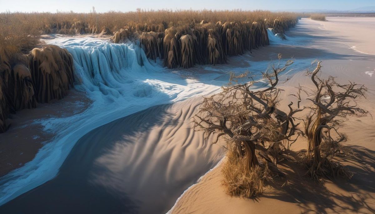 This image depicts a photorealistic scene of a toasted kapok tree overlooking dry sand dunes. Below, a frozen river and waterfall are being approached by a mudslide, creating a surreal juxtaposition.