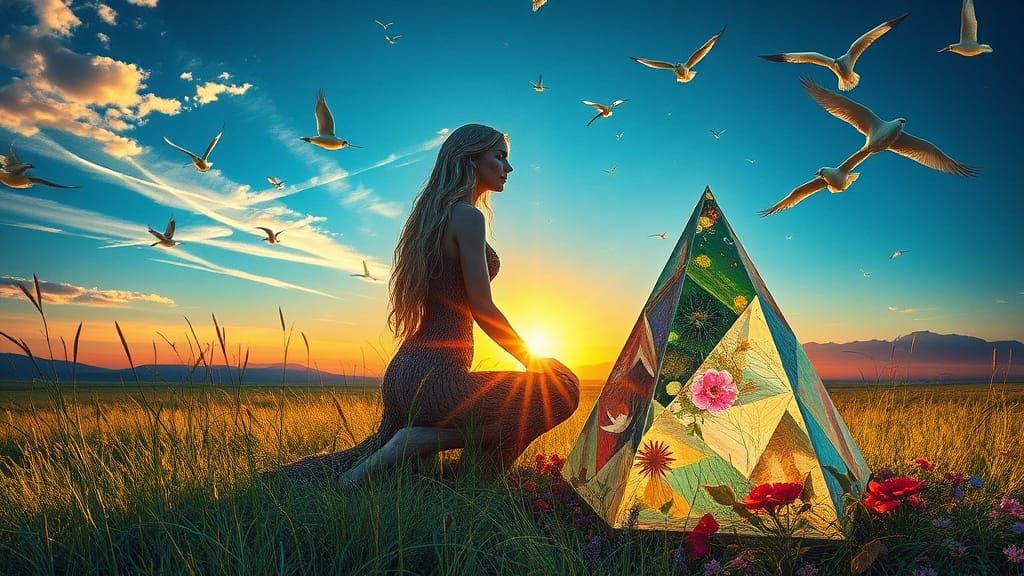 This image shows an eco-art sculpture blending a female figure with natural elements under a prism sunset. A collage of bio art with folklore creatures, birds, nature scenes and abstract designs.