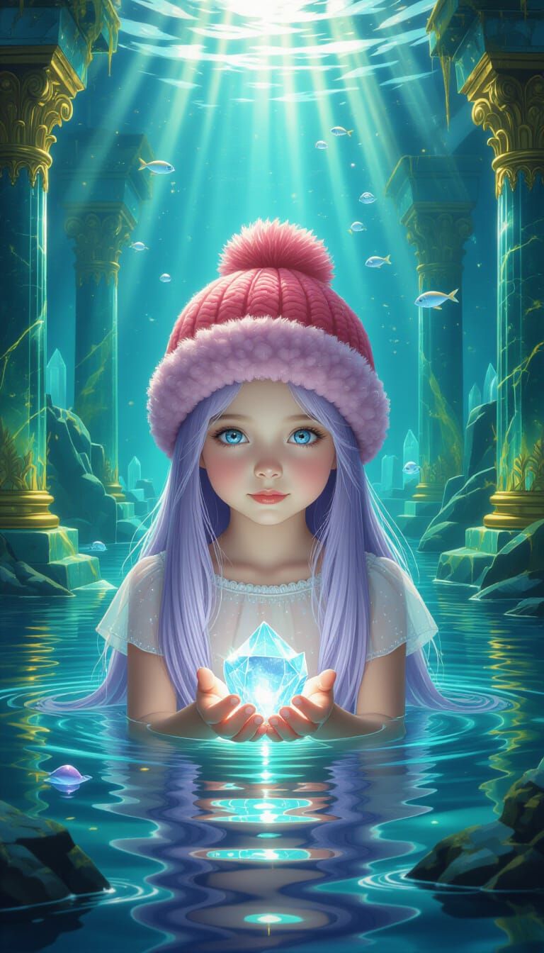 A hyper-realistic image of a girl with lavender hair in the glowing ruins of Atlantis. Features cinematic underwater lighting and ethereal tones.