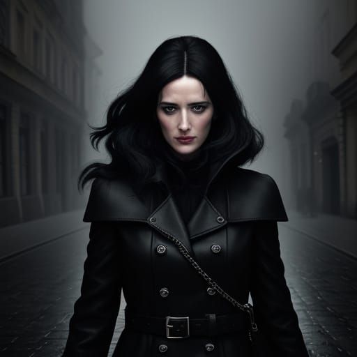 This image shows Eva Green as a dark-haired woman in a black coat standing in a misty Prague street at night. The noir photogram has a cinematic, moody aesthetic with polychromatic lights.