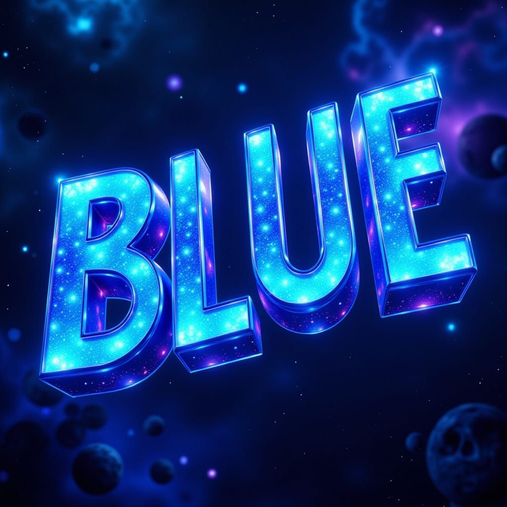 This image shows a shiny, holographic sign spelling "BLUE" floating in a deep space setting. Vibrant blue light emanates from the sign, with iridescent reflections against a backdrop of cosmic dust and nebulae. Rendered in a hyperrealistic, luminous digital art style.