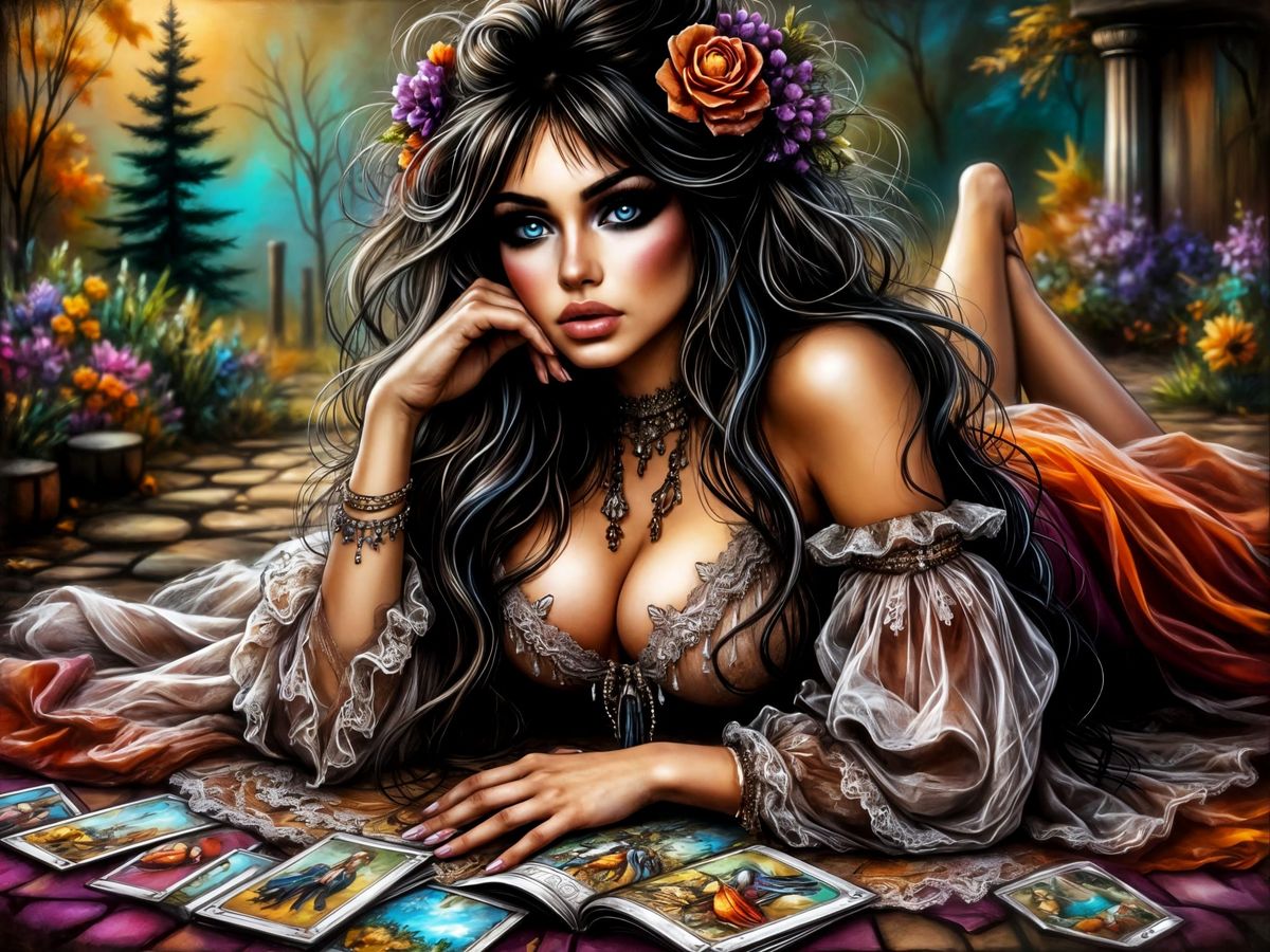 An enticing fortune teller in a colorful outfit lays out tarot cards with a knowing smile. The image captures a moment of mystical revelation.