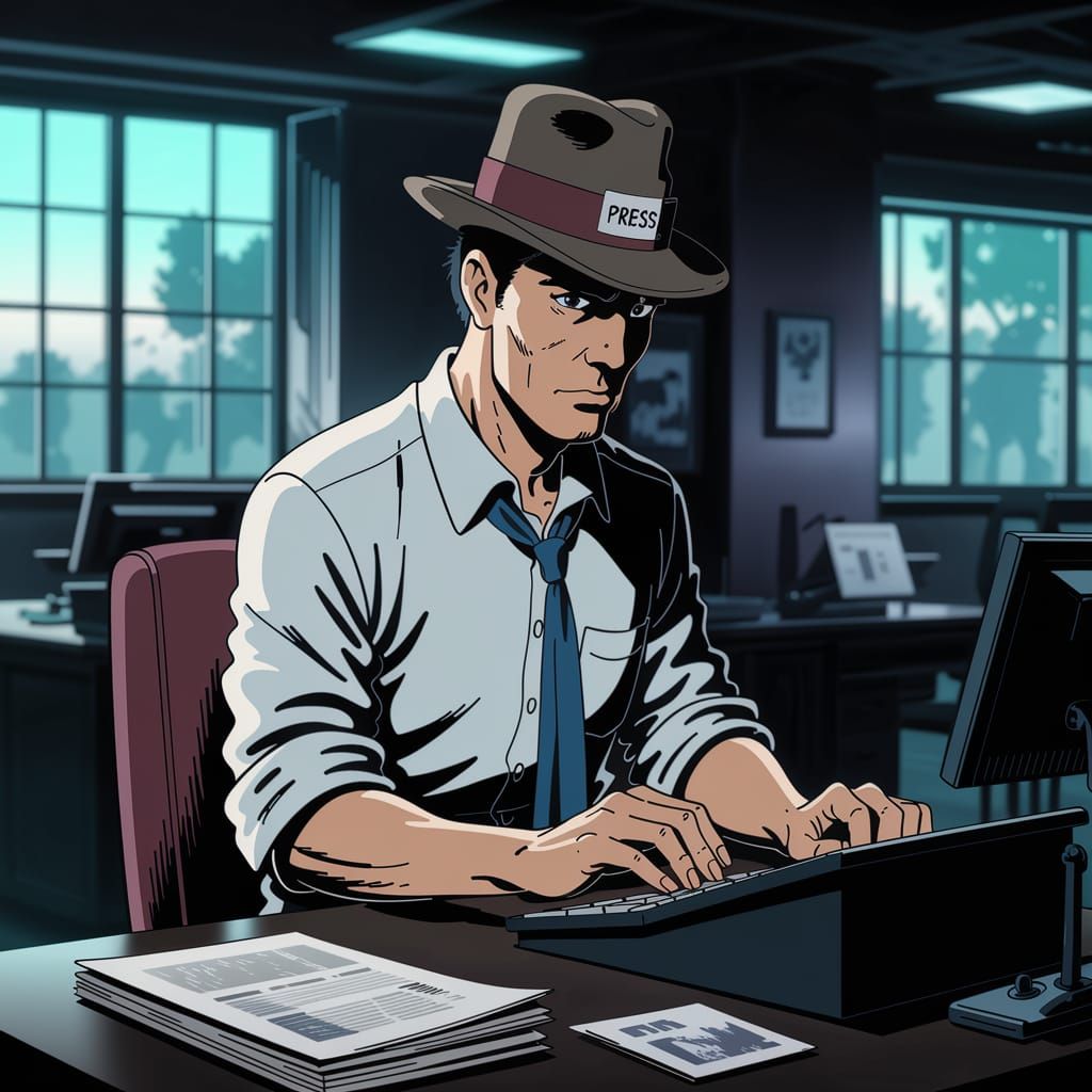 A lone 1940βs newsroom reporter, sits at his desk typing. He is wearing a button down white shirt with the sleeves rolled up to his elbows and loose tie. He is wearing a fedora with a card in the hatband that says βPRESSβ on it. Rendered in a gritty, cinematic style, with film grain, vignette, and color ...