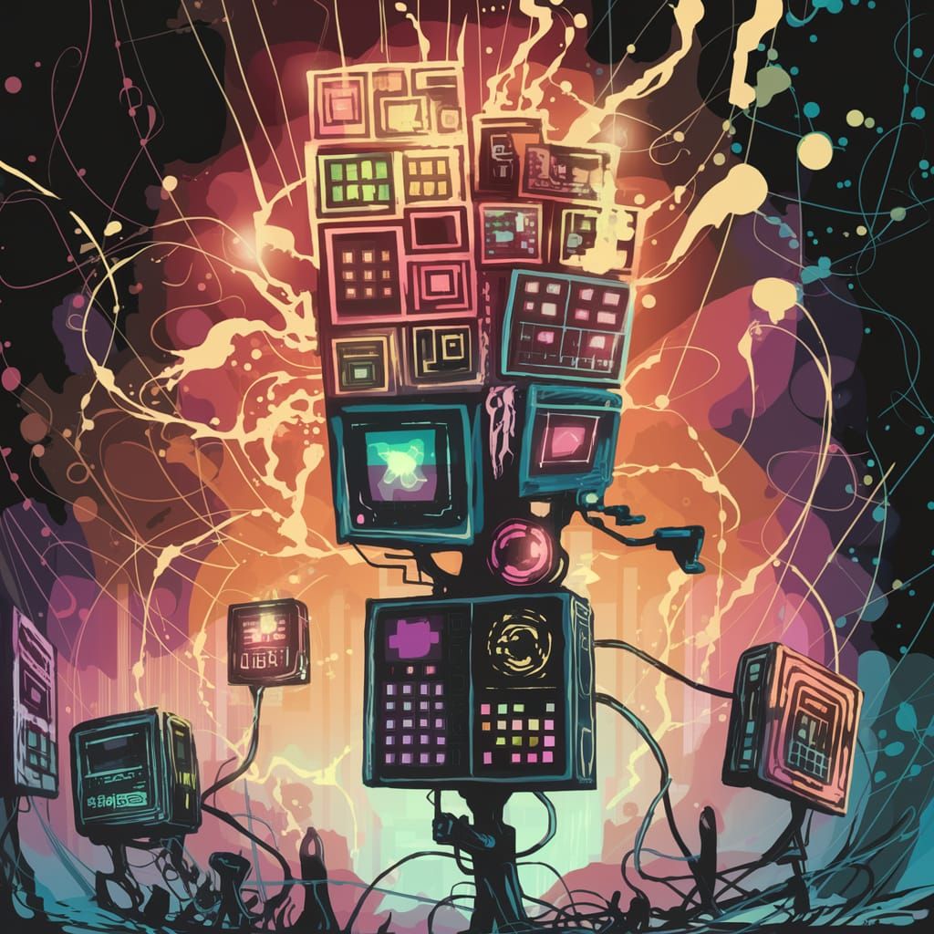 This image depicts a surreal, childlike scene of a chaotic battlefield, filled with colorful, patterned screens and abstract symbols, evoking the themes of digital information wars and politics. The warm, glowing hues and dynamic textures create a dreamlike atmosphere.