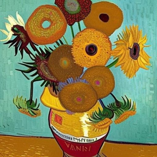 A striking picture of donuts arranged as flowers in a vase. The image uses post-impressionist techniques with thick brushstrokes and vivid colors reminiscent of Van Gogh's style.