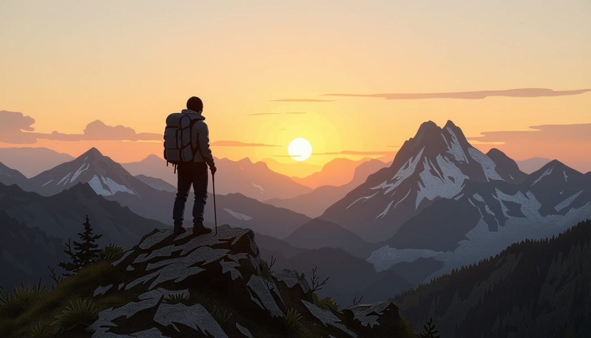 This image shows a solitary hiker silhouetted against a glorious sunrise viewed from a mountain peak. The landscape art evokes the style of 19th-century landscape painting with the simplicity of Japanese woodblock prints.