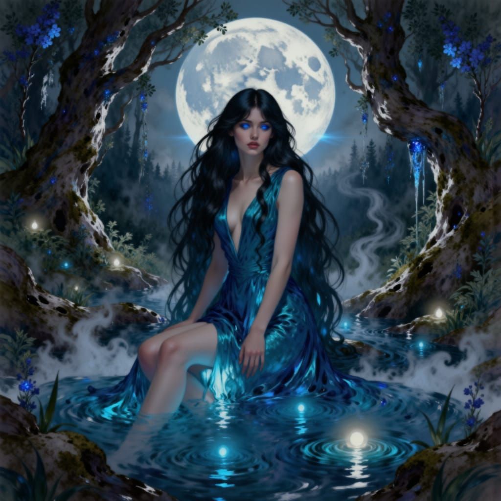 Beneath the glow of a sovereign moon, an azure-eyed guardian awakens amidst the mists and blossoms of light..... Sous l'éclat d'une lune souveraine, une gardienne aux yeux d'azur s'éveille parmi les brumes et les fleurs de lumière....