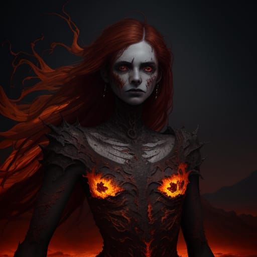 This evocative digital painting shows a woman in a hellfire dress with scars like molten gold in a desolate infernal landscape. Dramatic lighting emphasizes reds and oranges.
