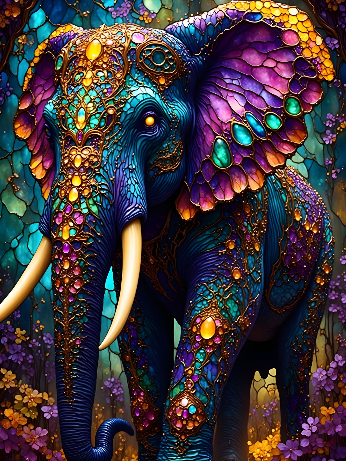 This image depicts a large, majestic elephant. It is richly decorated with intricate patterns, vibrant neon colors, tattoos, and beautiful jewels, showcasing a stunning visual display.
