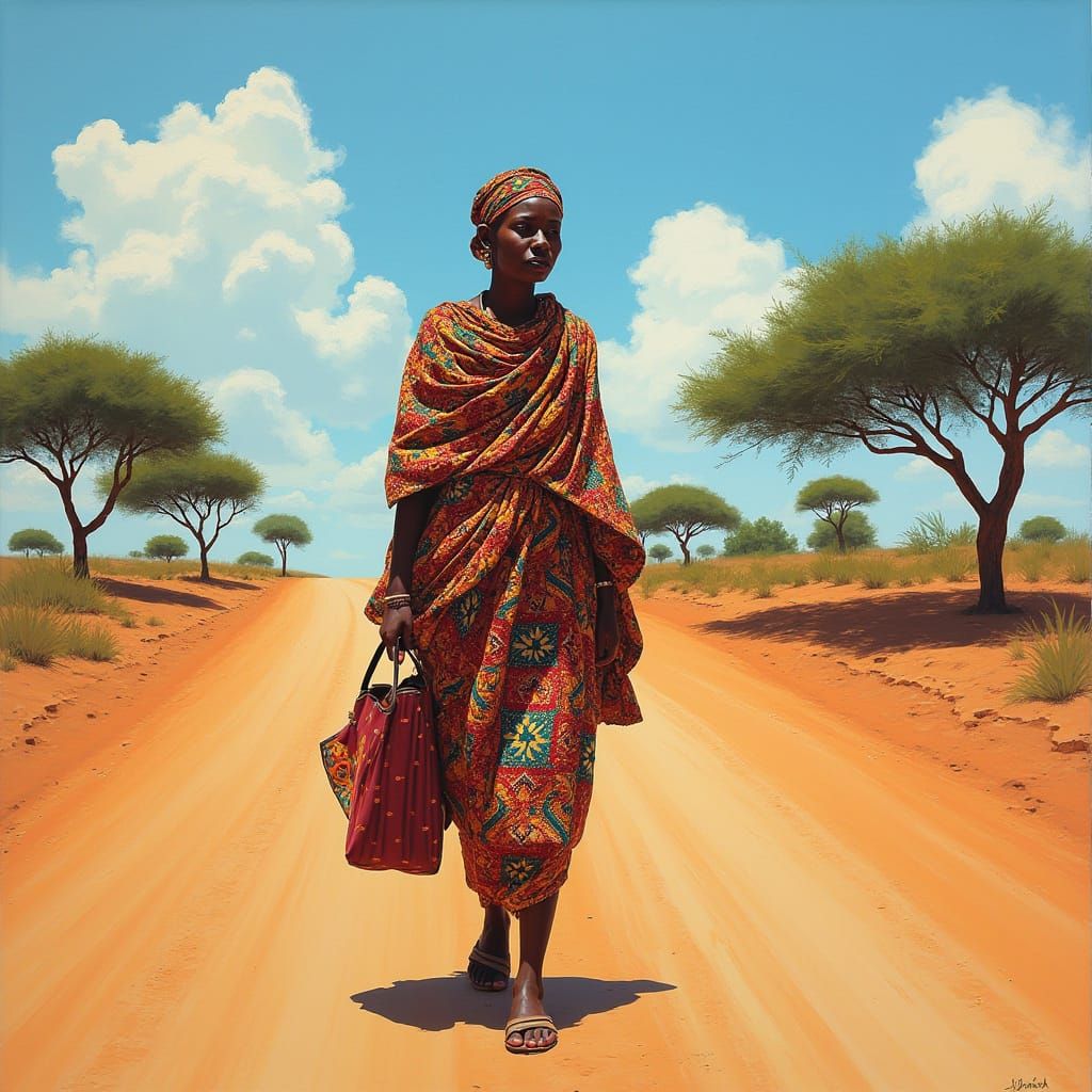 This image depicts a woman from Jamama, Somalia, walking along a sun-baked road lined with acacia trees, wearing a vibrant dirac dress in warm, earthy tones. The painting combines elements of traditional African art with bold brushstrokes and detailed textures.