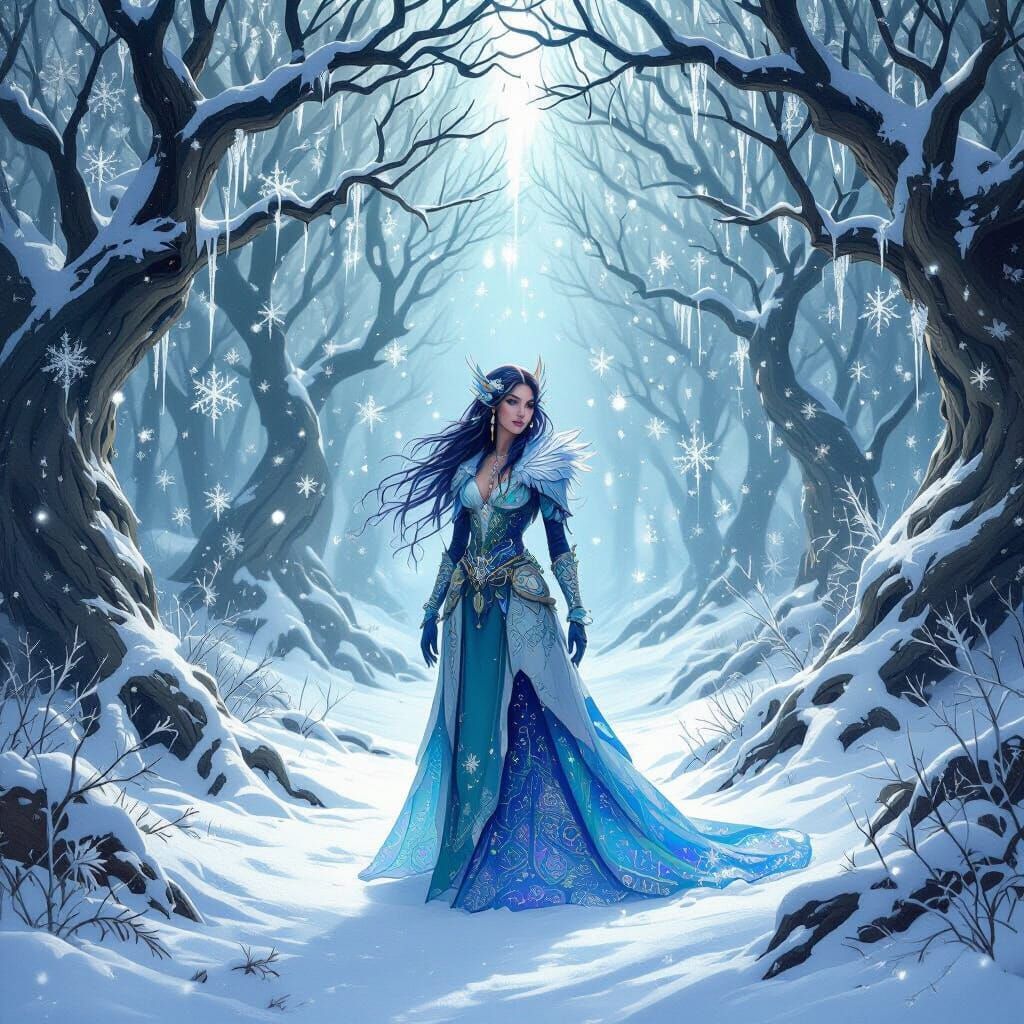 A fantasy concept art piece showing a striking Zora lead singer in a European-style snowy forest. Intricate details, atmospheric lighting, and a cool blue and white palette create a mystical scene.