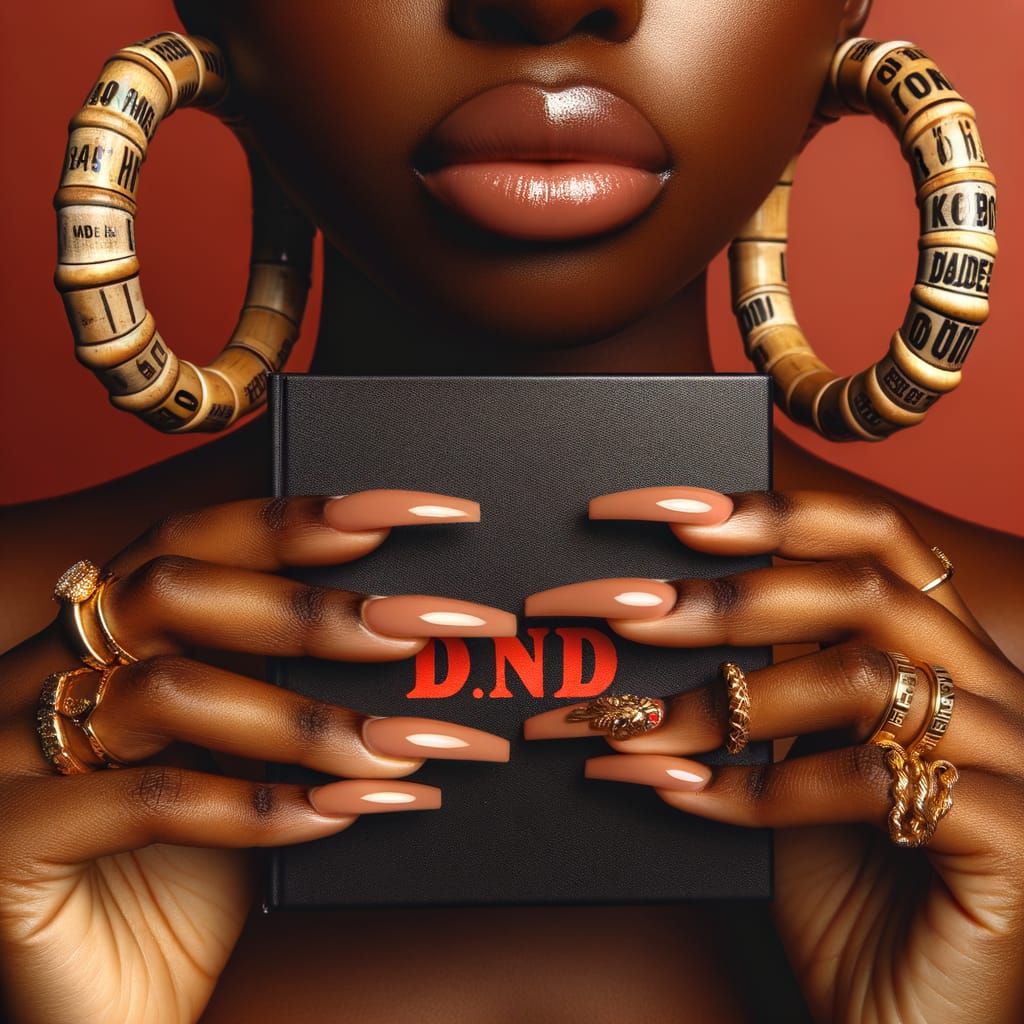 This image showcases a Black woman's hands holding a 'DND' album, focusing on her urban-styled nail design and gold rings. Large gold hoop earrings are visible against a vibrant red backdrop.