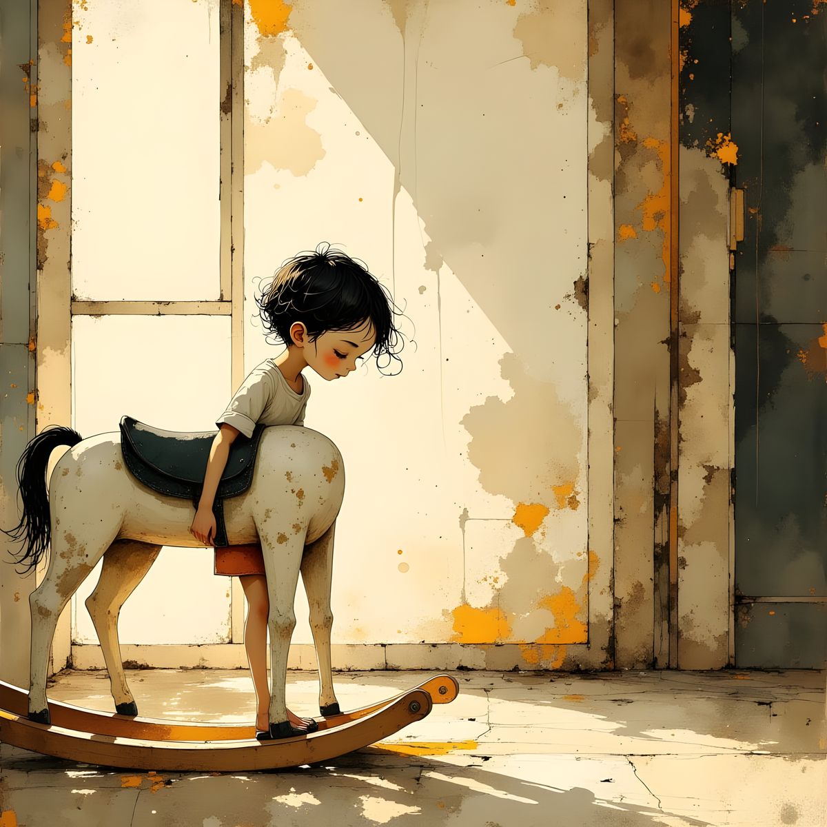 This image shows a charming, flat, hand-carved white rocking horse with a black saddle, held by a young Italian boy. Rendered in a vintage storybook illustrative style with muted colors and soft sunlight.