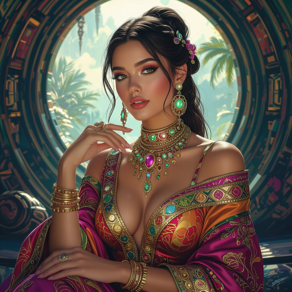 A striking picture of a woman in detailed, colorful clothing and futuristic jewelry, set in a fantastical world. This digital matte painting features deep, complementary colors and intricate details.