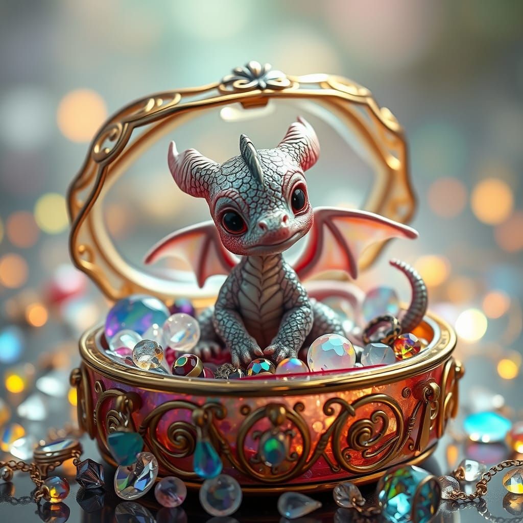 A delicate baby dragon sits amidst a treasure trove of glowing glass jewelry in a beautifully crafted glass box, evoking a sense of whimsy and enchantment in a dreamlike setting.