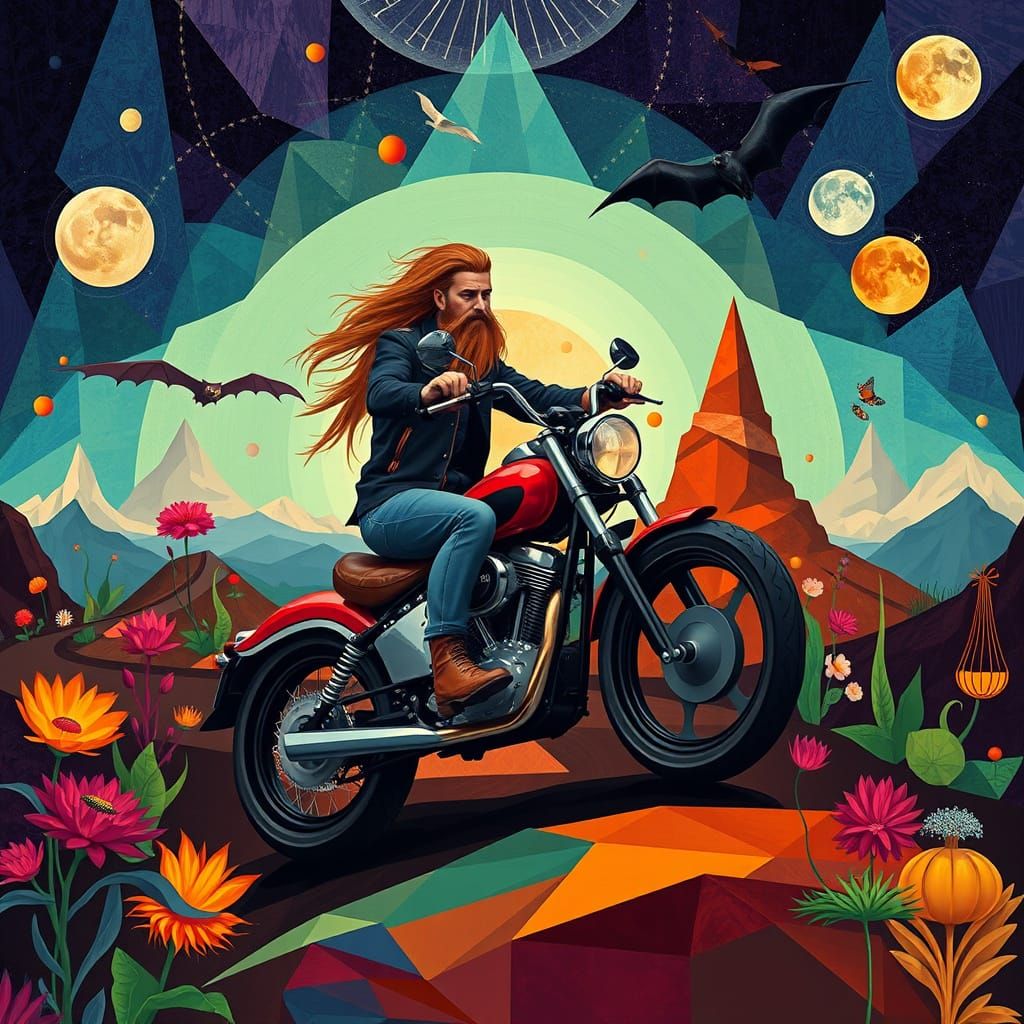 A stylized digital art piece depicting a long-haired biker navigating a surreal, Hieronymus Bosch-inspired landscape filled with geometric shapes and vibrant colors, blending elements of Cubism and Art Deco.