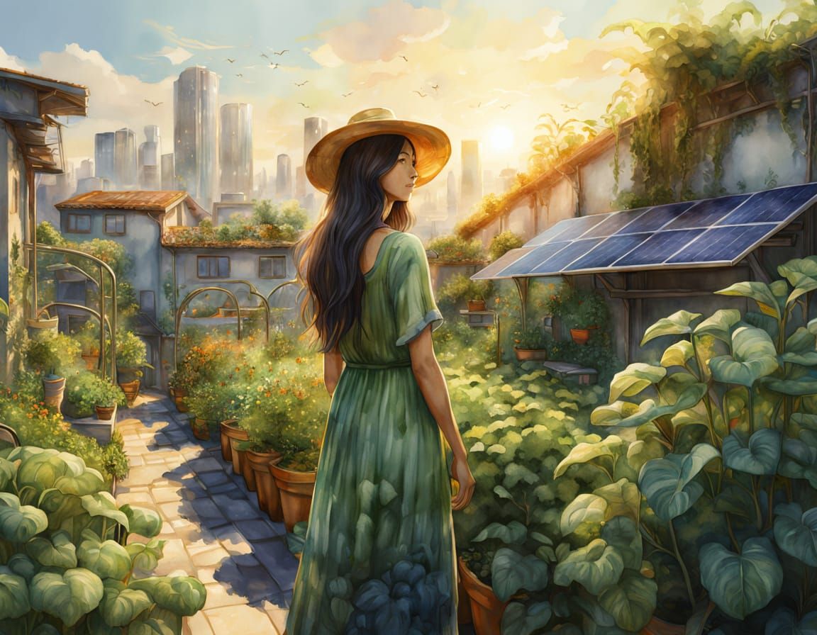 This image depicts a serene solarpunk cityscape featuring a lush rooftop garden, vibrant greenery, and solar panels glistening in the warm sunlight. The soft, diffused light and gentle brushstrokes evoke a sense of peacefulness and sustainability.
