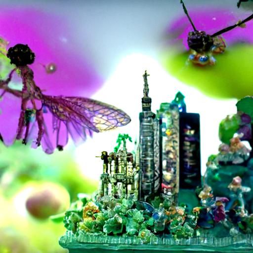This image shows a highly detailed naturepunk city with bubble towers, winged nymphs, fairies, and angels, creating a utopian scene. The artwork has an angelic aesthetic.