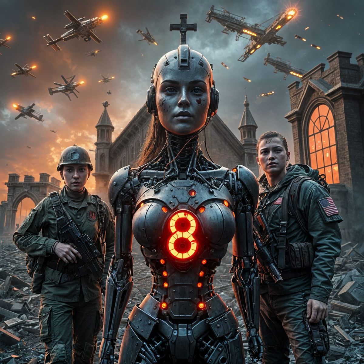 This haunting image depicts a group of weary U.S. Marines standing alongside a severely damaged, female battle robot, amidst the ruins of a war-torn chapel and desolate streets, with a backdrop of chaos and destruction.