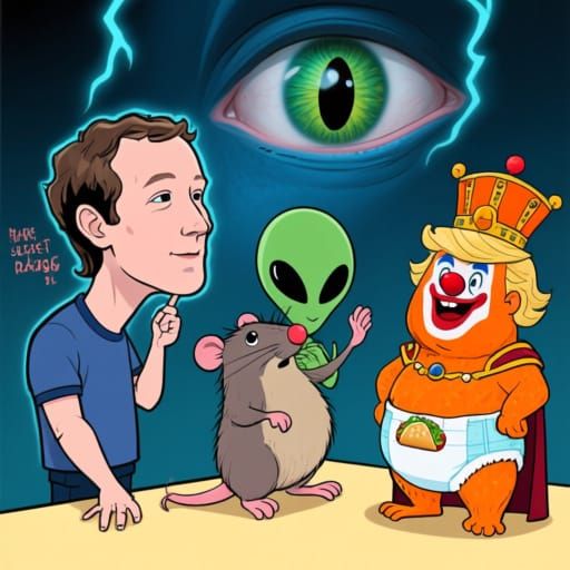 A humorous caricature of three famous figures as bizarre hybrid creatures. The artwork uses exaggerated features and grotesque imagery to create a satirical commentary on their public personas.