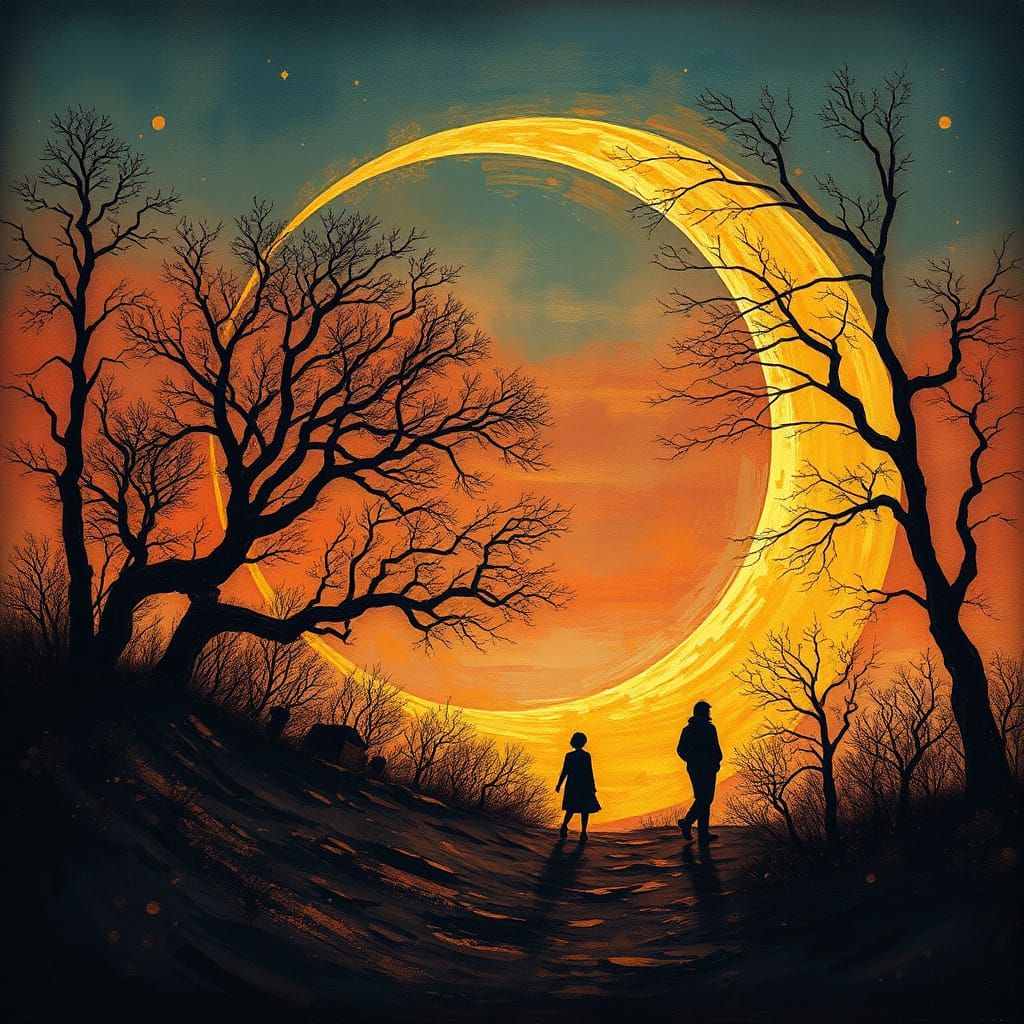 This image depicts a glowing autumn scene at dusk, showcasing a striking golden ratio composition with a thick oil patina effect. The art style blends glitchcore elements for a unique visual.