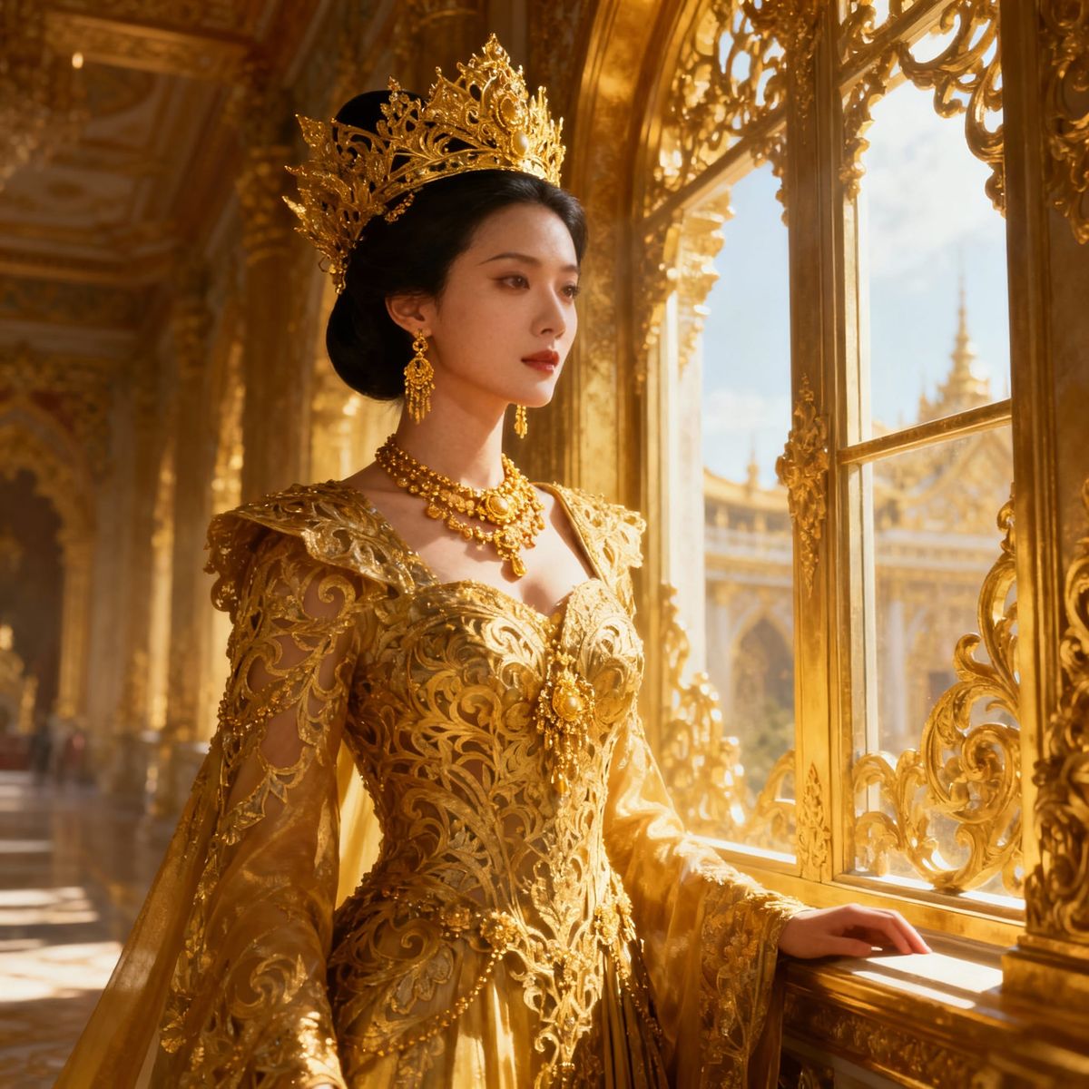 This hyper-detailed digital matte painting showcases a stunning fantasy empress in a luxurious gold gown and crown, set within a grand palace. Features cinematic lighting and rich textures.