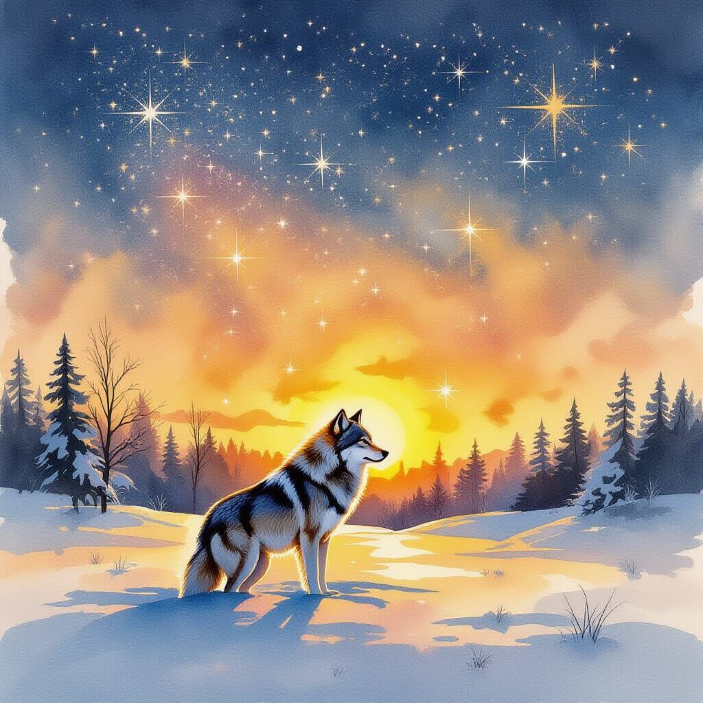 A watercolor painting of a wolf beneath a starry winter sky at sunset. Golden light and soft brushstrokes create a dreamy, ethereal scene in shimmering watercolor style.