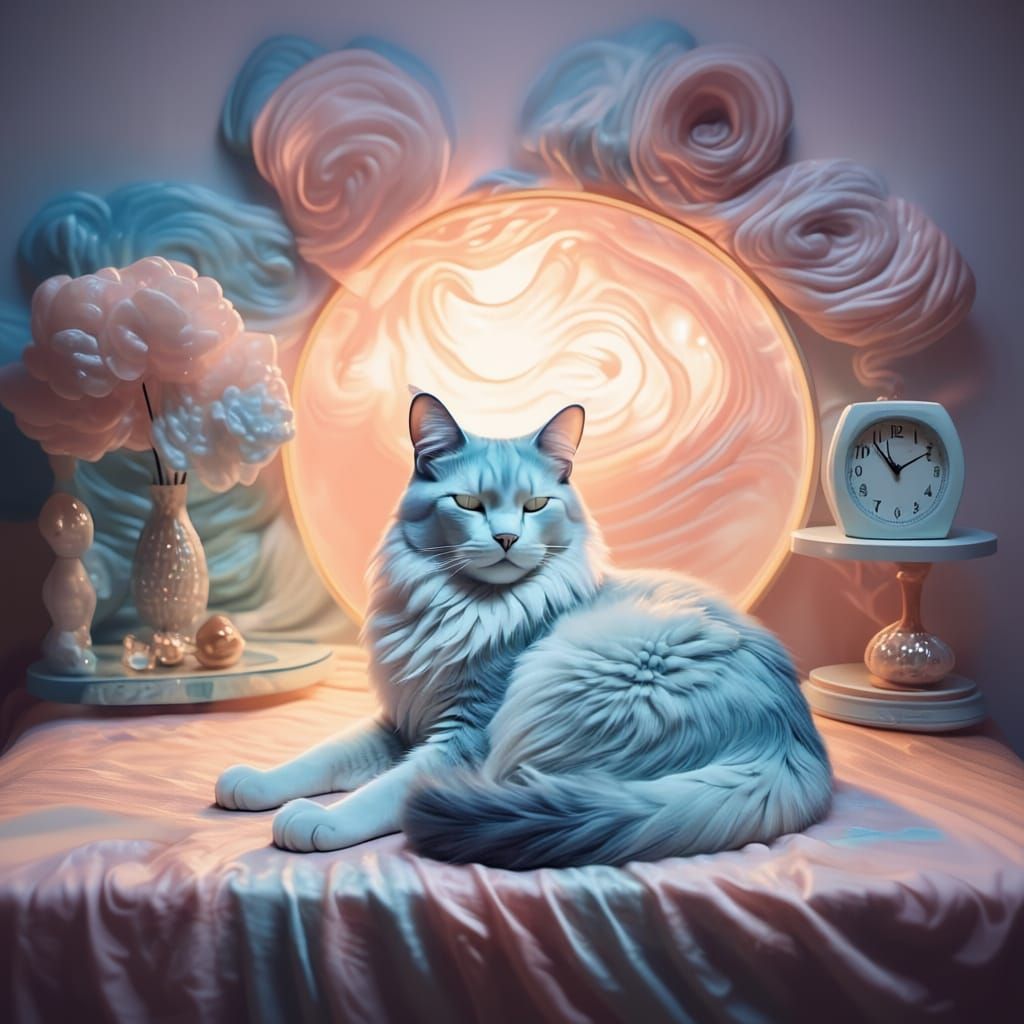 This image shows a cat sleeping peacefully in a cozy, surrealist bedroom. The artwork employs a resin pour technique, creating a fluid and ethereal atmosphere.