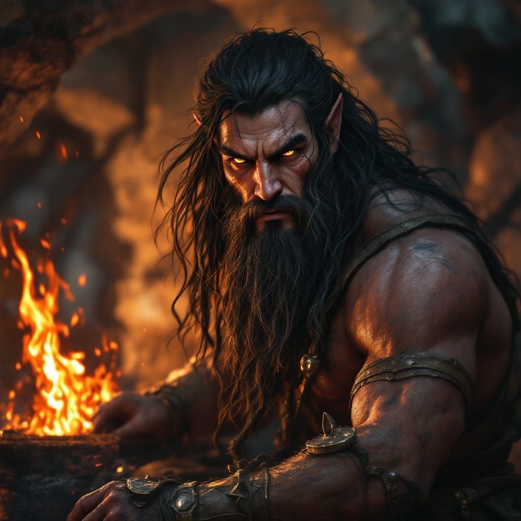 This image shows a powerful centaur blacksmith set against a fiery forge backdrop, with intricate details and rich colors reminiscent of fantastical art. A kind gaze and rough features make for a compelling portrait.