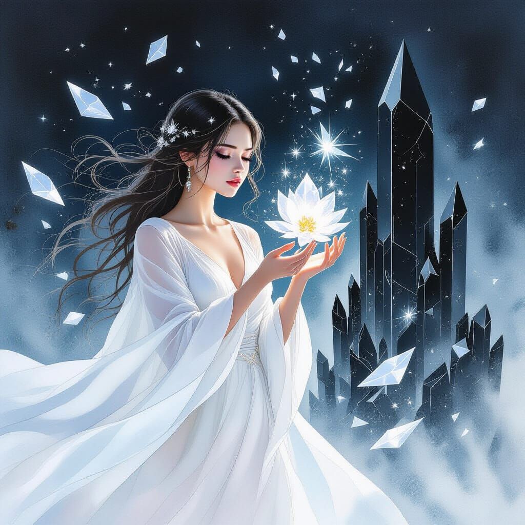 This image shows an ethereal woman holding a glowing crystal blossom before a cracking crystal fortress. The artwork is rendered in a watercolor style, with delicate lines and vibrant colors, in a dreamlike composition.