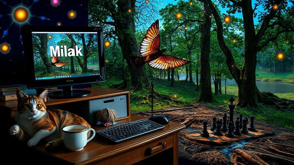 This image features a calico cat on a vintage desk with a computer. A surreal collage art style with bioluminescent and neon elements creates a vibrant, dreamlike scene.