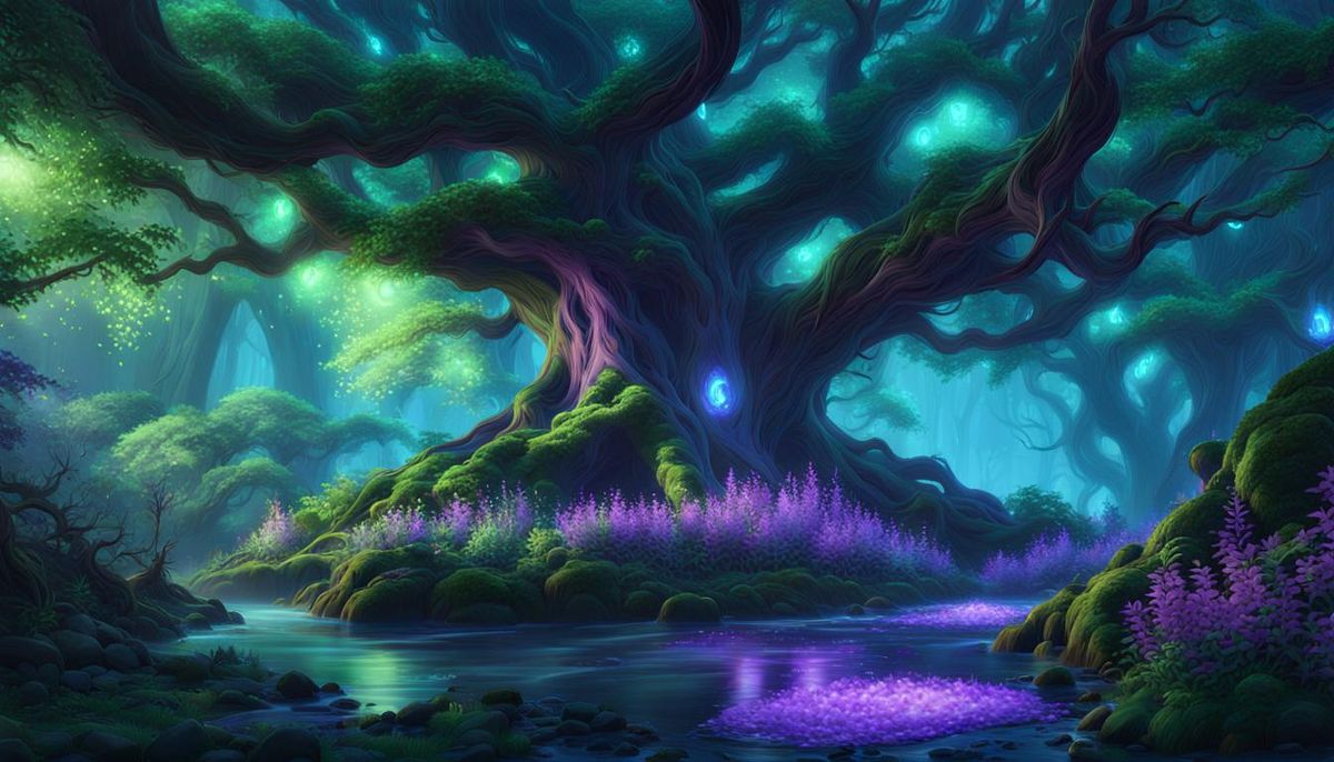 A vibrant image showcases an enchanted forest filled with glowing, bioluminescent trees. The scene is rendered with extreme detail and an aesthetic inspired by 3D anime art.