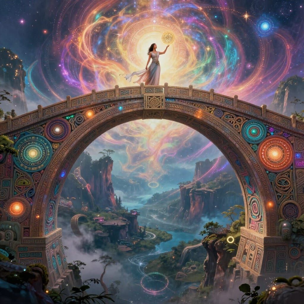 This image depicts a spiritual sky bridge adorned with ancient symbols and orbs, merging magical realms. A woman holds a key symbol, uniting two worlds.