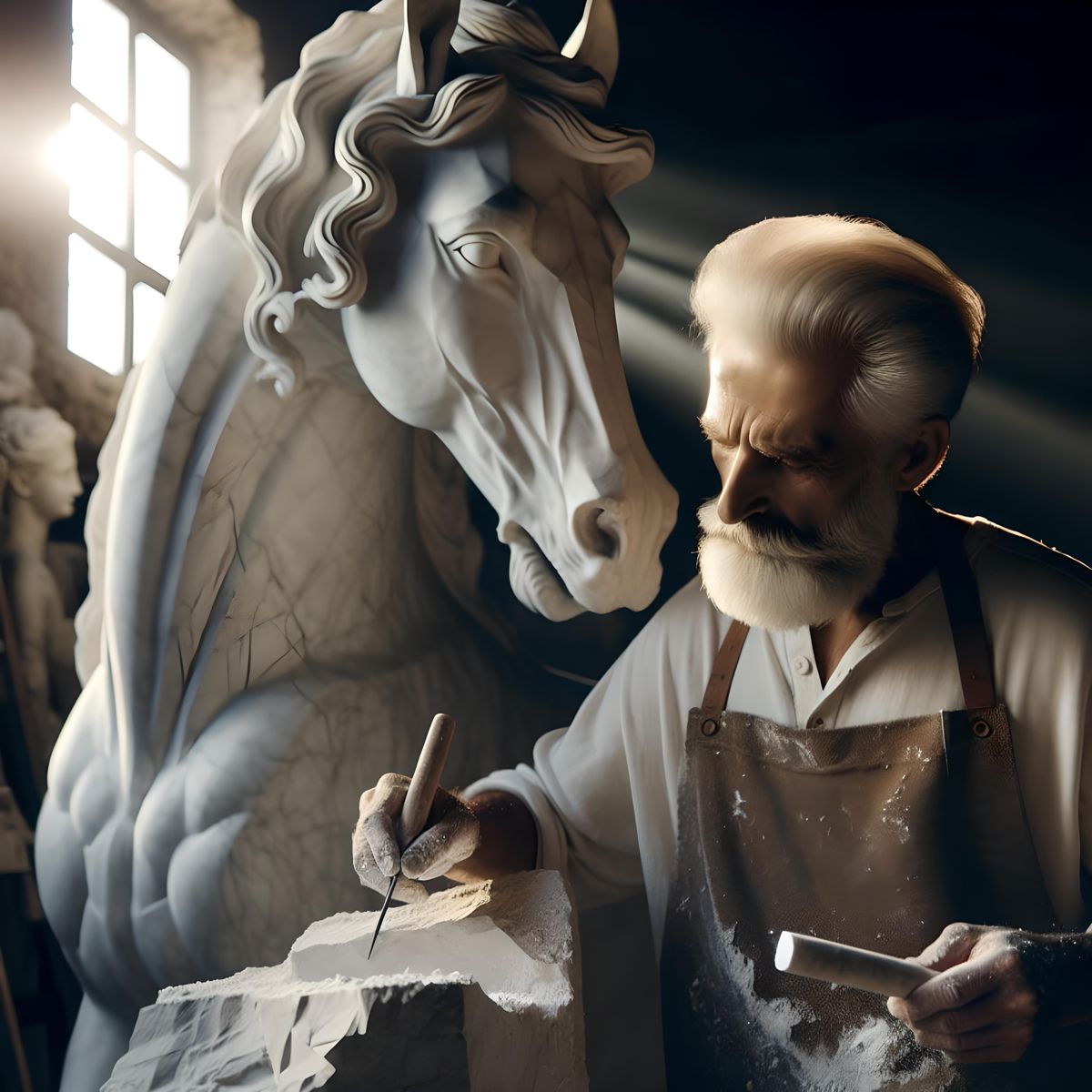 A cinematic image of an elderly sculptor in his sunlit workshop. He lovingly touches a massive, unfinished white marble statue of a stallion, covered in carving dust. High contrast and extreme detail.