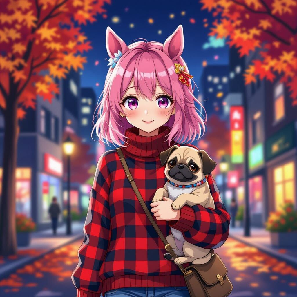 This image depicts a charming anime woman with pink hair and horse ears, wearing a checkered sweater, in a vibrant night city. The artwork features deep colors and meticulous details in a cel-shaded aesthetic.
