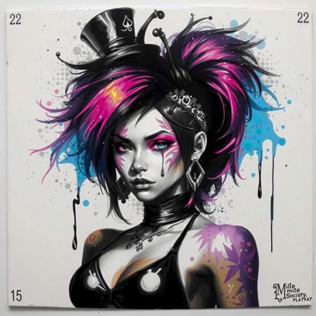 A shy young woman as the Queen of Spades, wearing a spades-themed bikini. Features graffiti and splash art elements with vibrant colors and high contrast.