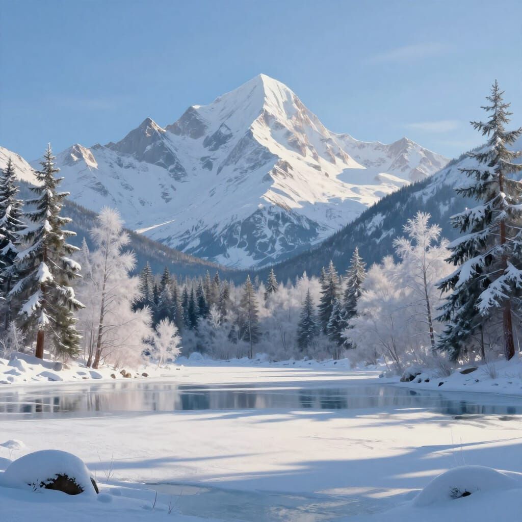 This image shows a majestic, snow-covered mountain landscape with a frozen lake. Pine trees dusted with snow are visible. The scene is rendered in a hyperrealistic digital painting style, evoking vastness and solitude.